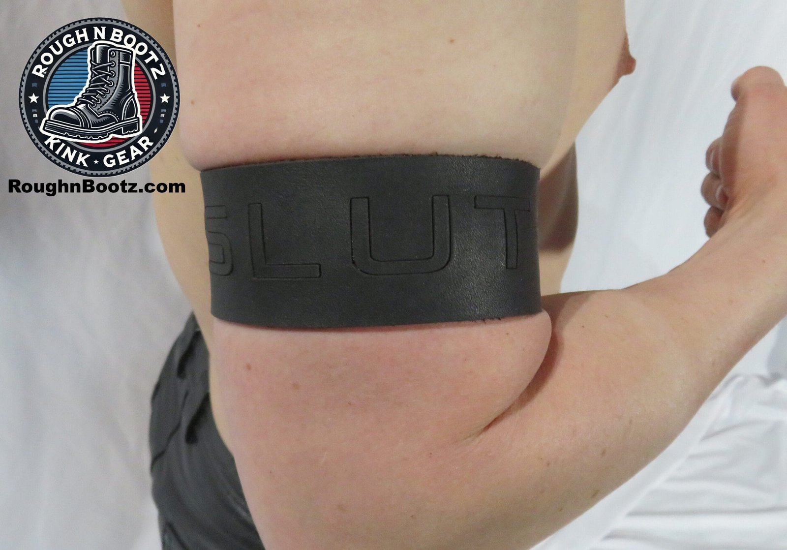 An engraved leather arm band designed to be worn on the upper arm as a discreet form of identification or expression.