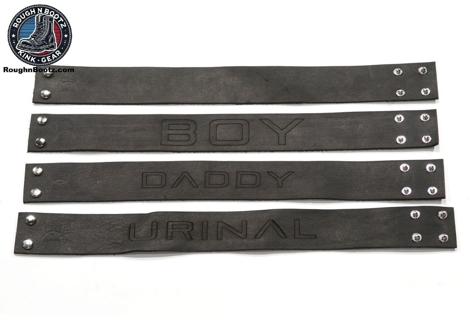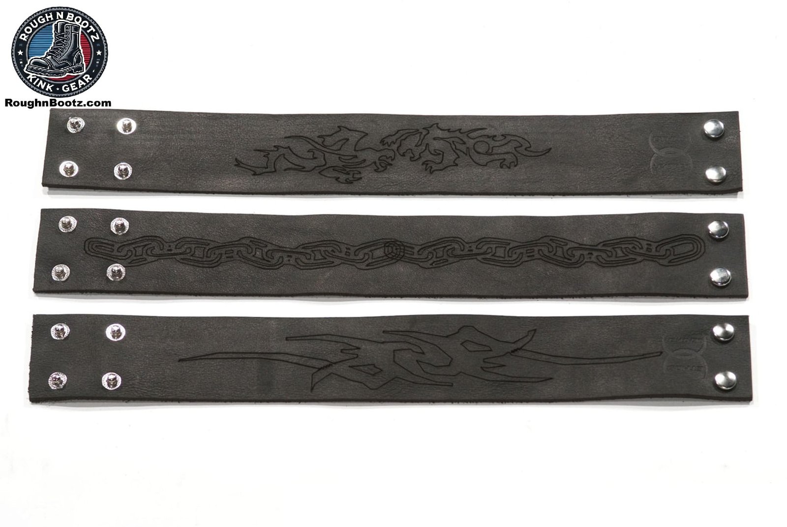 This engraved leather arm band offers a subtle, intentional way to flag identity or affiliation. Designed to be worn on the upper arm, it combines clean lines with engraved detail, making it equally suited for everyday wear or scene use. One boy we know uses his as a scene collar. We have many designs to choose from, check the dropdown menu.