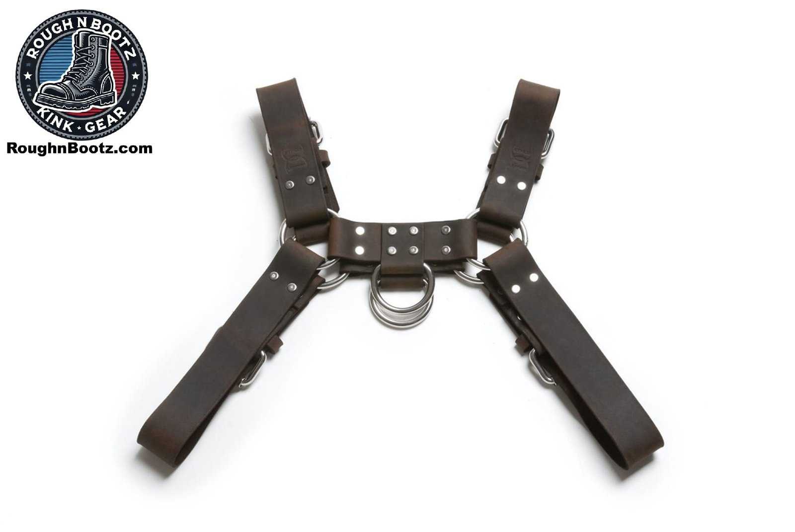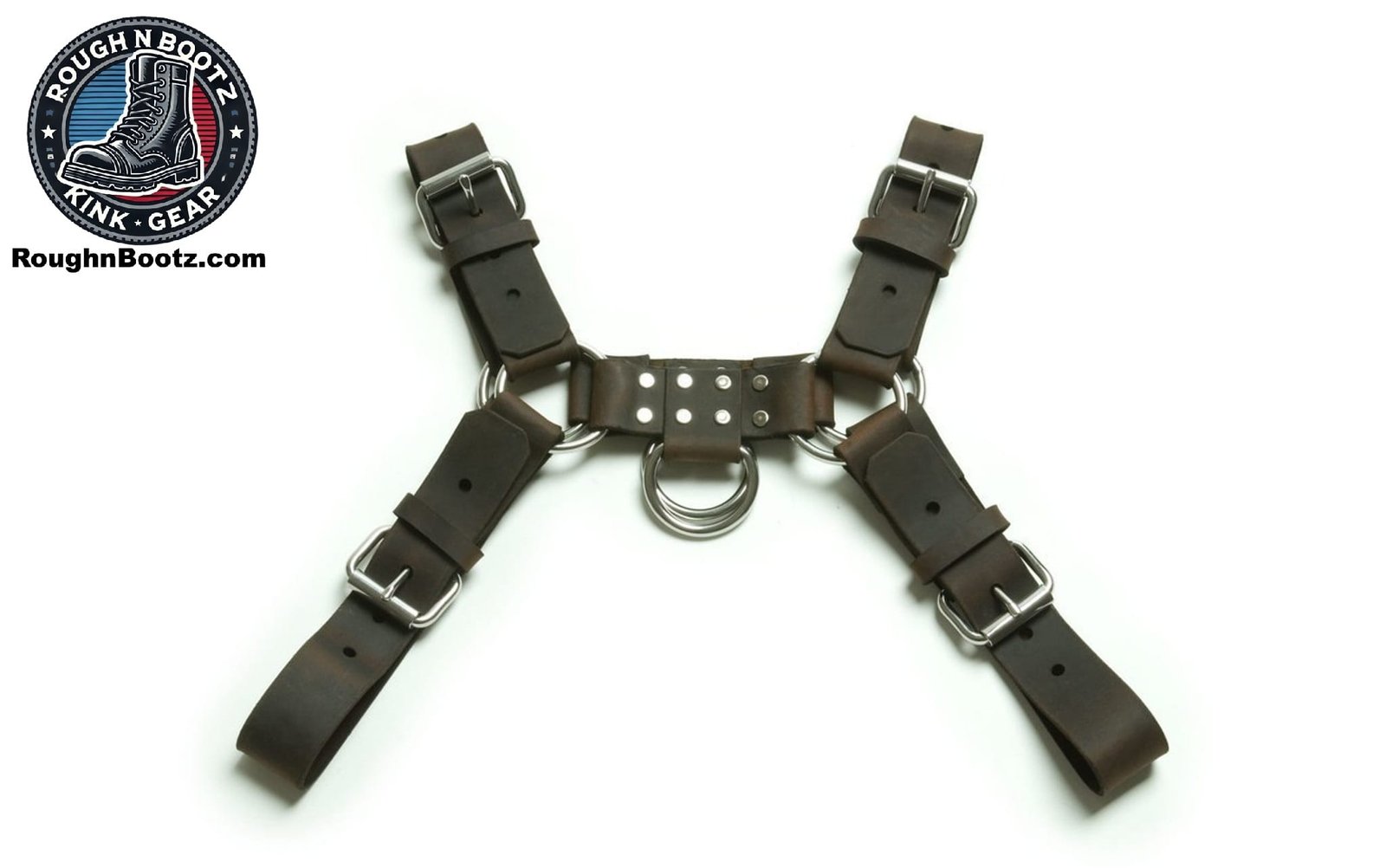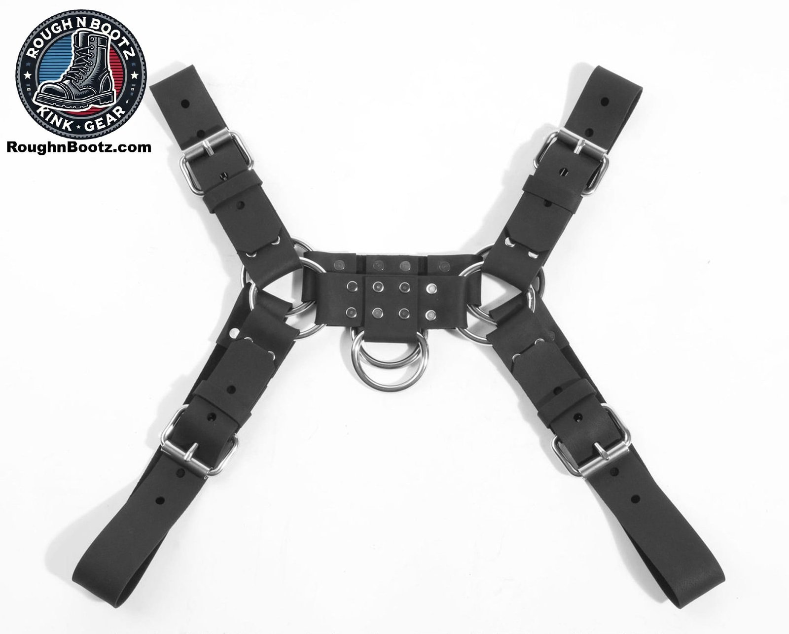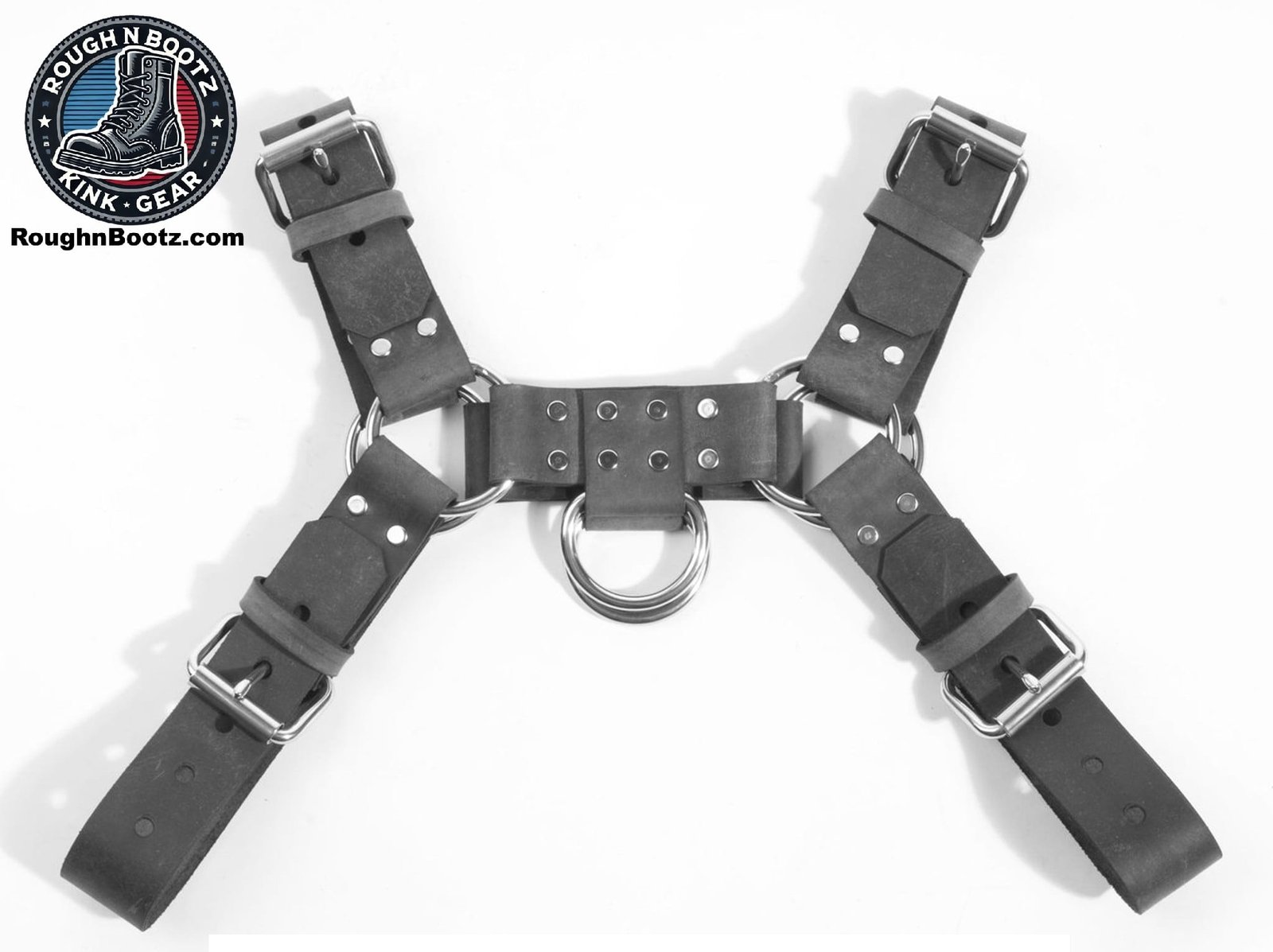 A more secure fit and some extra D-rings give the bulldog harness an edgier look than its older brother the X harness. D-rings also mean the bulldog is functional, not just fashionable. Combine it with our strap sling for some great doggy-style action or use it alone to secure your bottom someplace fun. Harness is constructed of sturdy 10 ounce 1.5″ wide black latigo leather. All materials are domestically sourced and gear is handmade in Tacoma, Washington.