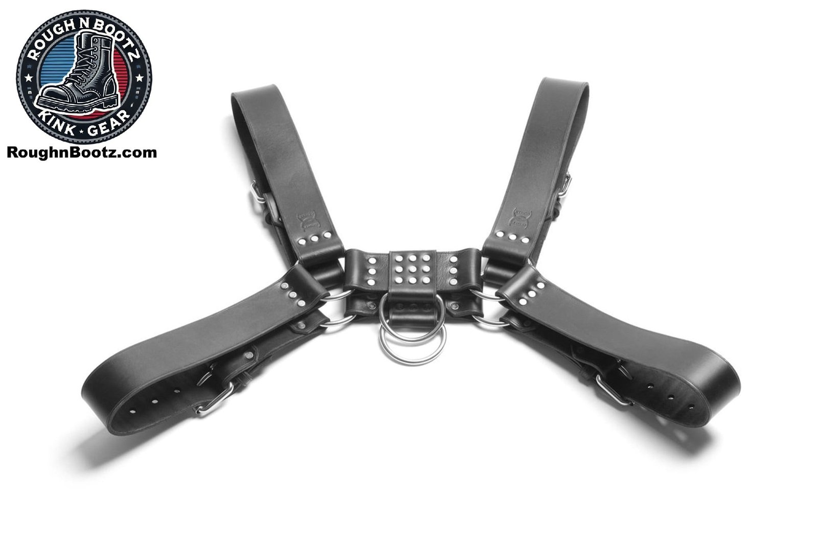 This harness was designed and made for the big bears in our community. Based on our Bulldog harness but made with 2″ wide straps and many more rivets this harness is properly proportioned for bears in the XXL-XXXL size range. It’s heavy construction will stand up to many years of hard pounding and thrusting – we hope you enjoy it. Harness is constructed of sturdy 8-10 ounce black latigo leather. All materials are domestically sourced and gear is handmade in Tacoma, Washington