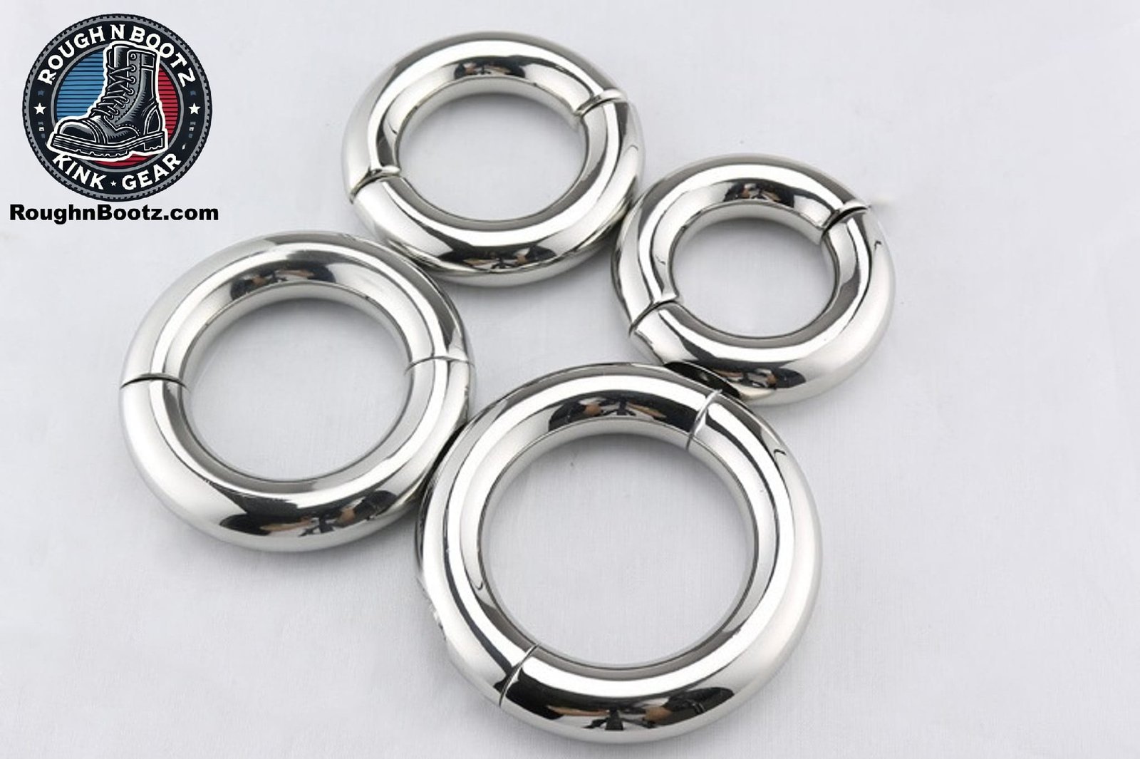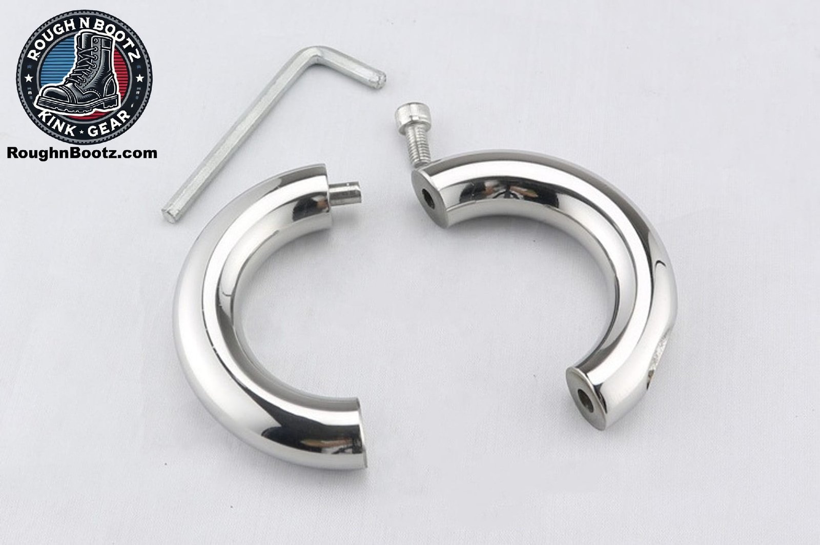 These simple solid stainless steel cockrings are great for long term wear and stretching your cock and balls or just balls. Ideal for men with previous stretching or heavy cockring experience, these rings are great because the two piece design allows you to wear a cockring that is one size smaller then the standard slip-on type. This helps prevent the ring from falling off if you are wearing it while soft and for this reason they are especially great for growers. We know you pigs might want even more weight for heavy stretching and for this we recommend stacking multiple cockrings together. If you are just starting out with stretching, you can try these rings but limit yourself to an hour or two at a time until you grow accustomed to the weight and do not do anything strenuous while wearing this cockring.