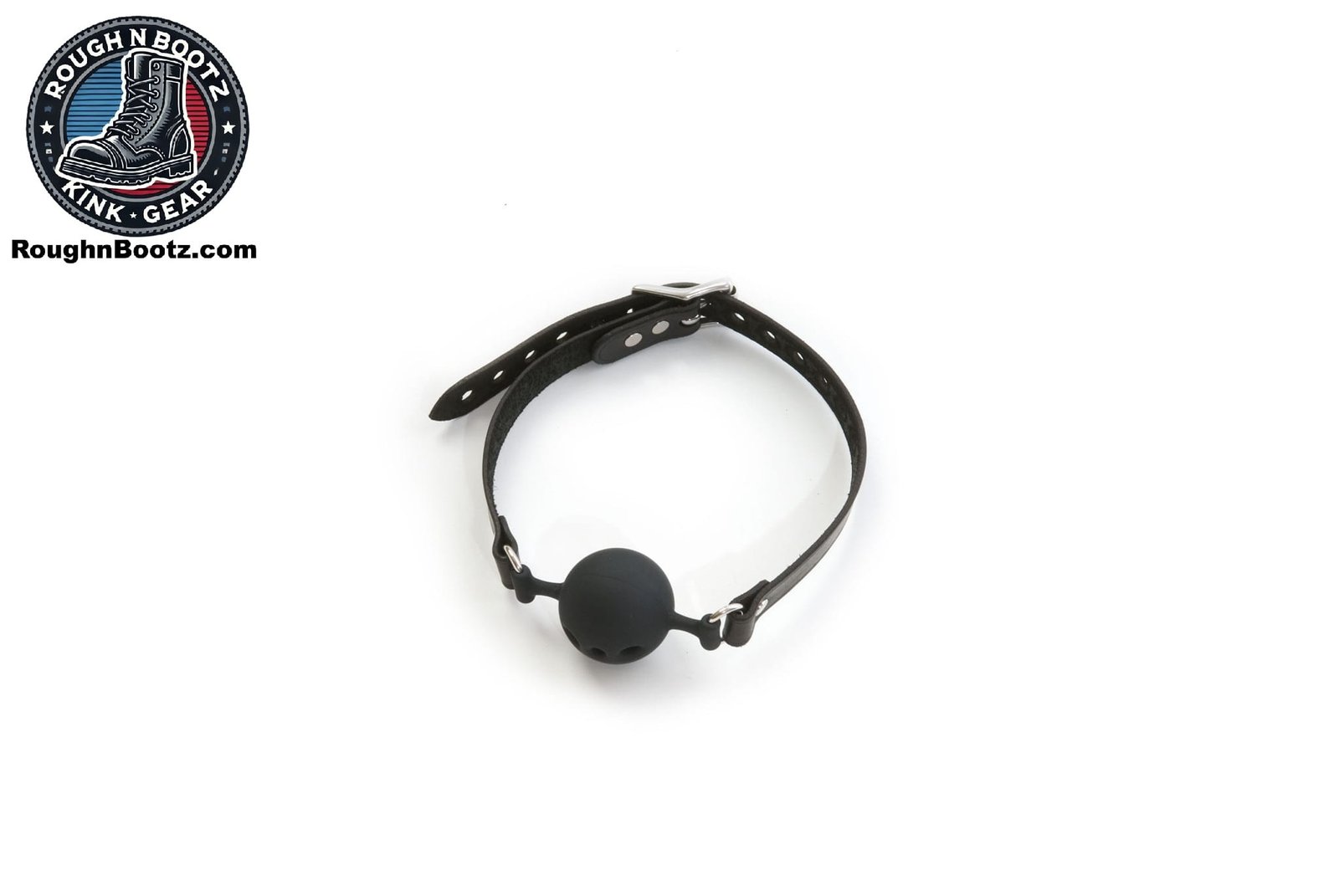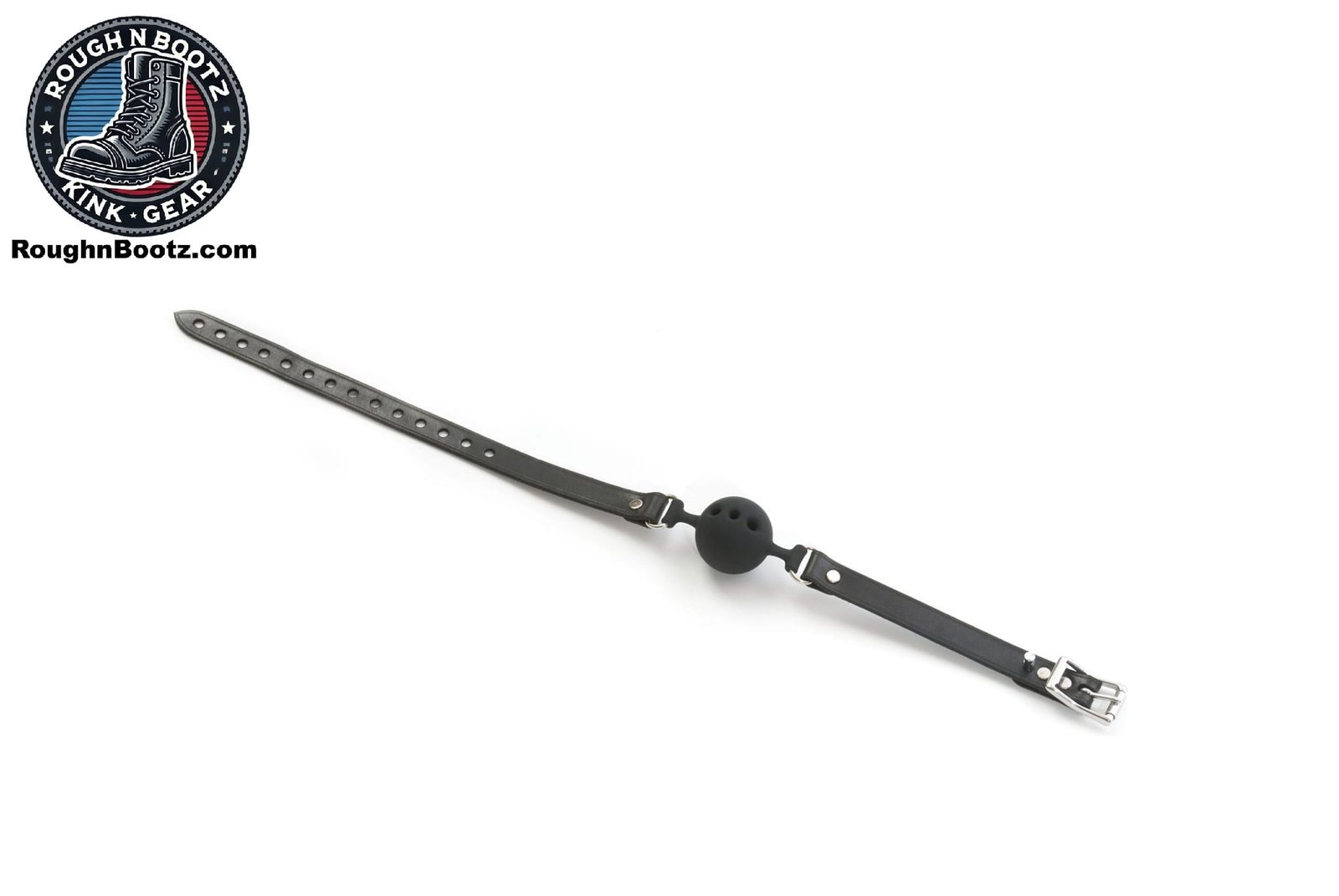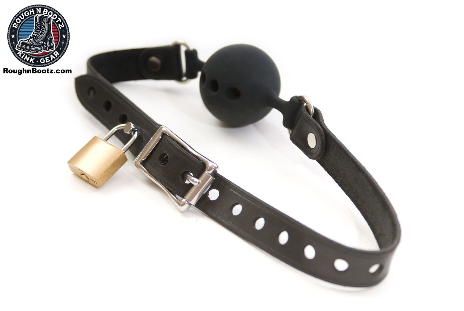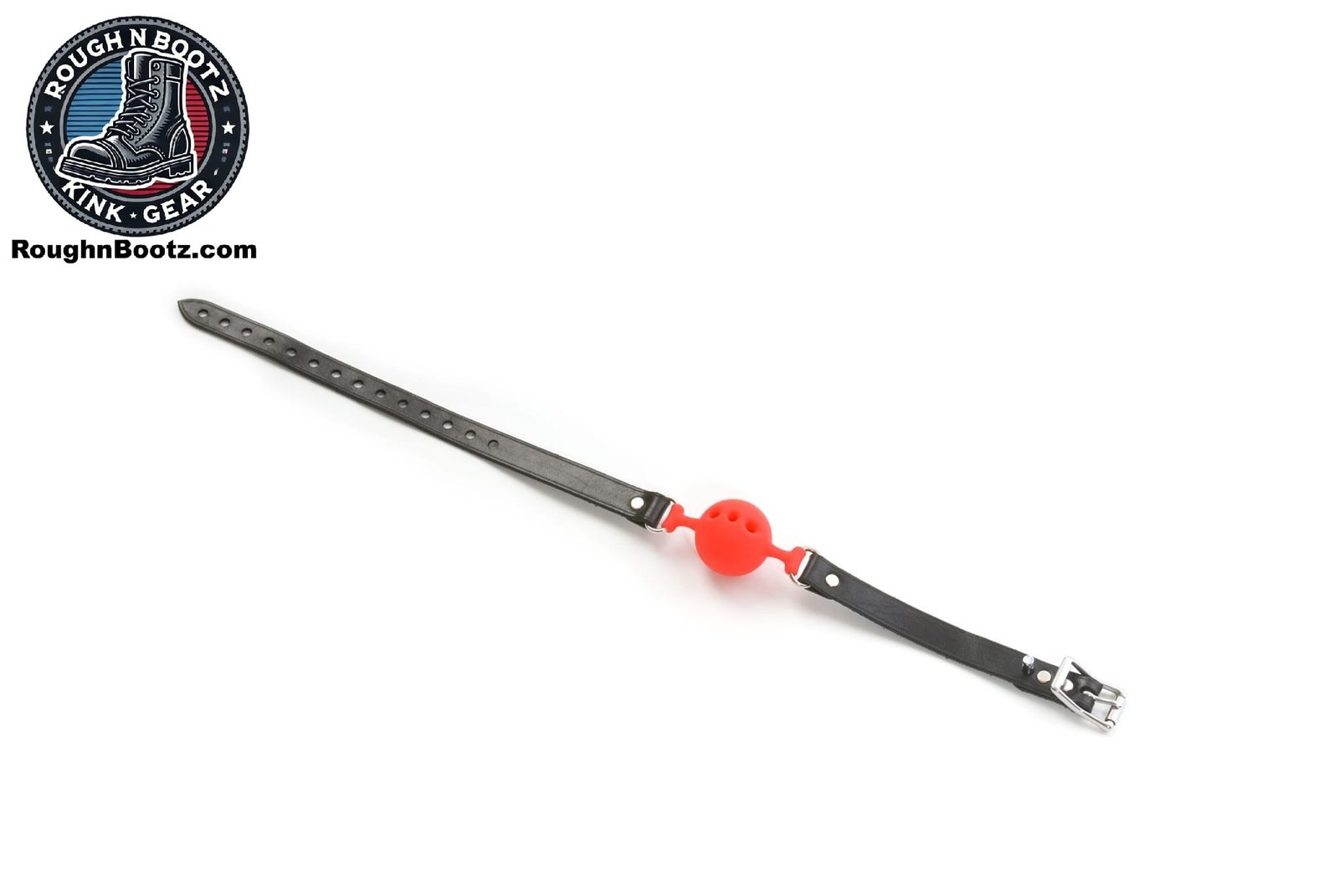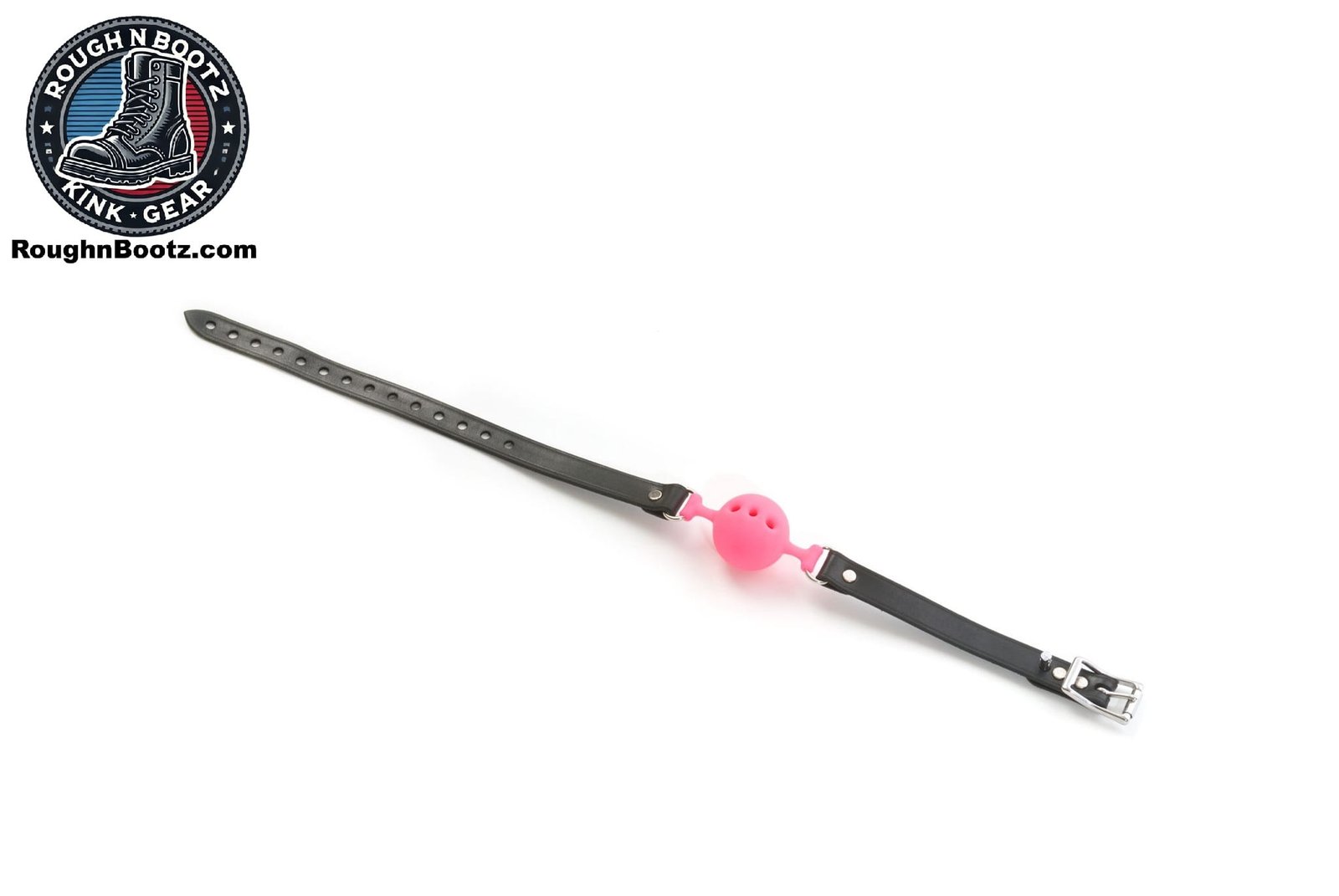 Our new ball gags start with high quality solid silicone ball with three air holes. The silicone is both tasteless and odorless – no nasty tasting and/or smelly rubber here. Our gags are designed and built to take a lot of use without failing. Biting though the silicone is nearly impossible – so this is likely the last ball gag you will need to buy. Available in two different sizes so you can get that perfect gagging fit, we recommend the medium unless you know you have a very large mouth to fill. The latigo leather strap includes a locking post for a small luggage lock (not supplied) and holes every half inch to make sure the fit is perfect. Available in black, red, and pink.