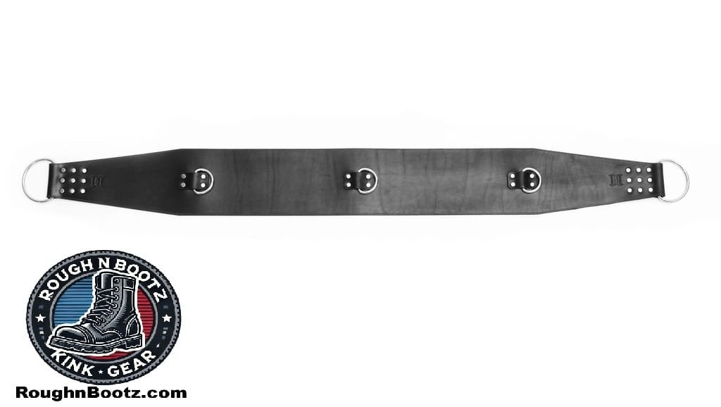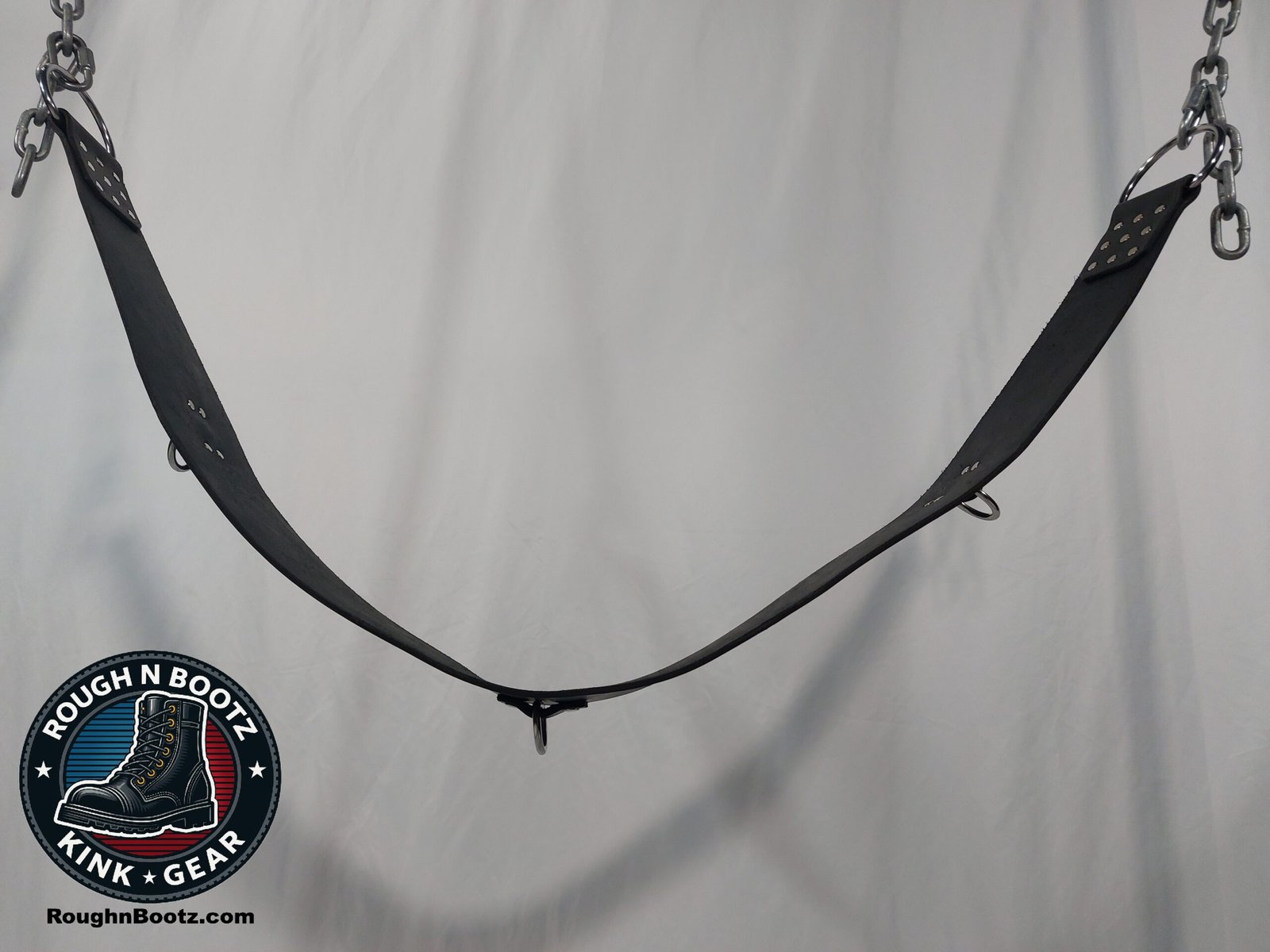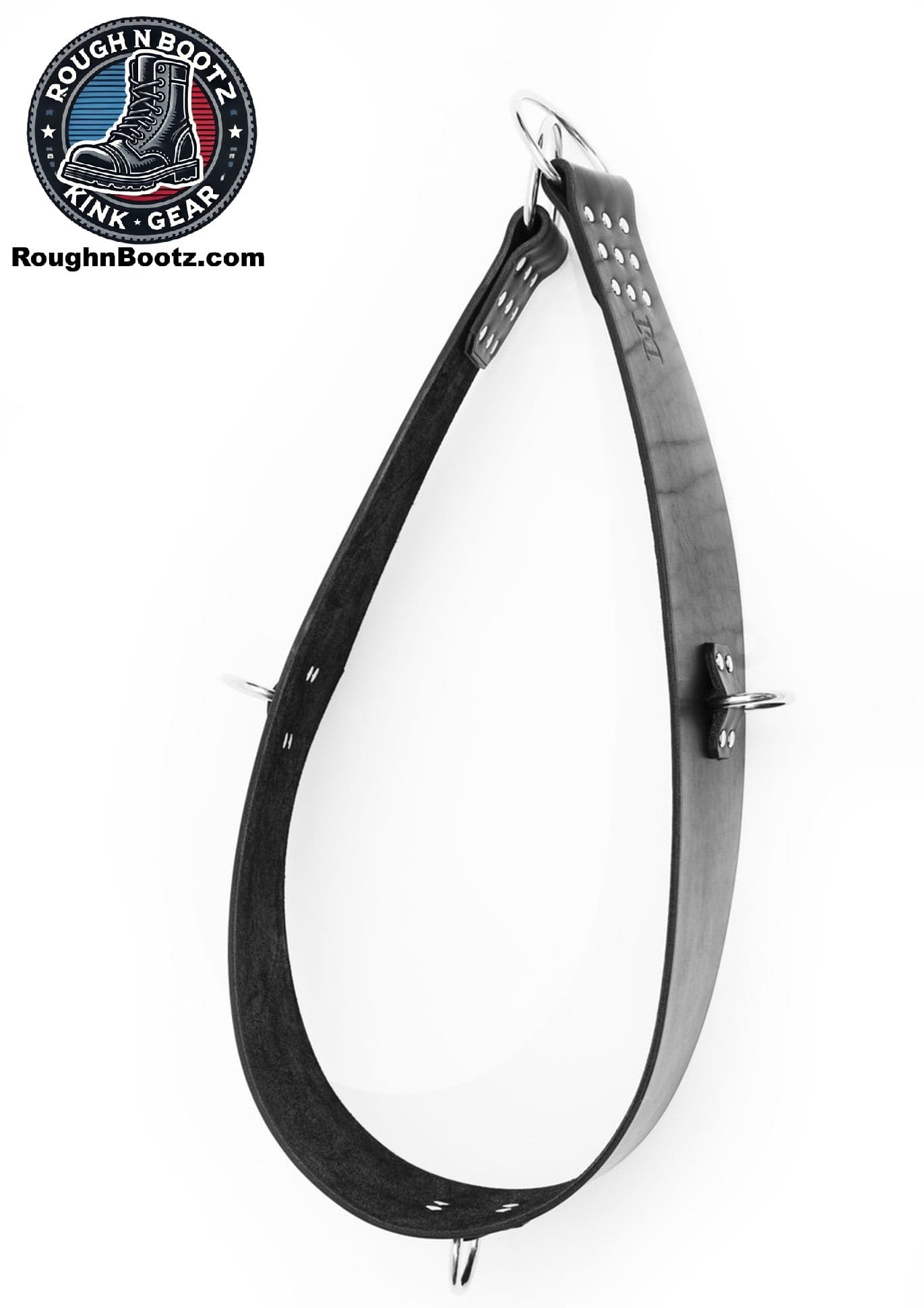 Our new Suspension Straps are a modified version of our Sling Straps. This simplified version is ideal for low ceilings or portable suspension stands. We added a second load bearing D-ring so that now our straps have a open ended design, this allows the straps to be added to a suspension after the bottom is suspended and enables a faster release at the end of your scene. These straps can be used for many load bearing suspension positions and offer support in many different ways. You could use these just like our Sling Straps for a doggie style suspension with one strap around each thigh with both load bearing d-rings from each strap connecting to a carabiner, attached to chain and in conjunction with our suspension harness. You could use a single strap (in conjunction with rope or other suspension gear) to help support the lower back during a suspension in a doggie or missionary position. You could use three Suspension Straps for a doggie style suspension: one for each thigh, one for the lower back plus a suspension harness – doing so would increase the bottoms comfort for long suspensions. Please keep in mind that you will still need a suspension harness or rope/leather chest harness to use this Suspension Strap (ie: please don’t use these Suspension Straps as the sole load bearing item, a chest harness is still necessary to prevent the bottom from shifting lengthwise in the suspension and potentially sliding out of the Suspension Straps). Three 1.25″ D-rings gives the top many options for attaching cuffs to. The Suspension Strap is constructed of sturdy 9-10 ounce black latigo leather. Rivets are chrome plated brass, all other hardware is stainless steel. All materials are domestically sourced and gear is handmade in Tacoma, Washington