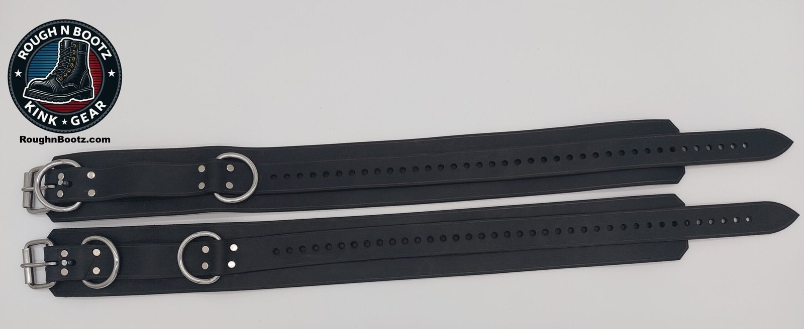 Designed to match our universal cuffs these thigh cuffs add a little more immobility to the picture.  Lock your sub’s legs together so you can laugh while they try to walk, strap arms to sides, or hold their legs apart for perfect crotch access.  Whatever position you choose, locking posts ensure your sub won’t be going anywhere.  Locking posts are chrome plated steel (locks not provided), all other hardware is stainless steel.  All materials are domestically sourced and gear is handmade in Tacoma, Washington.