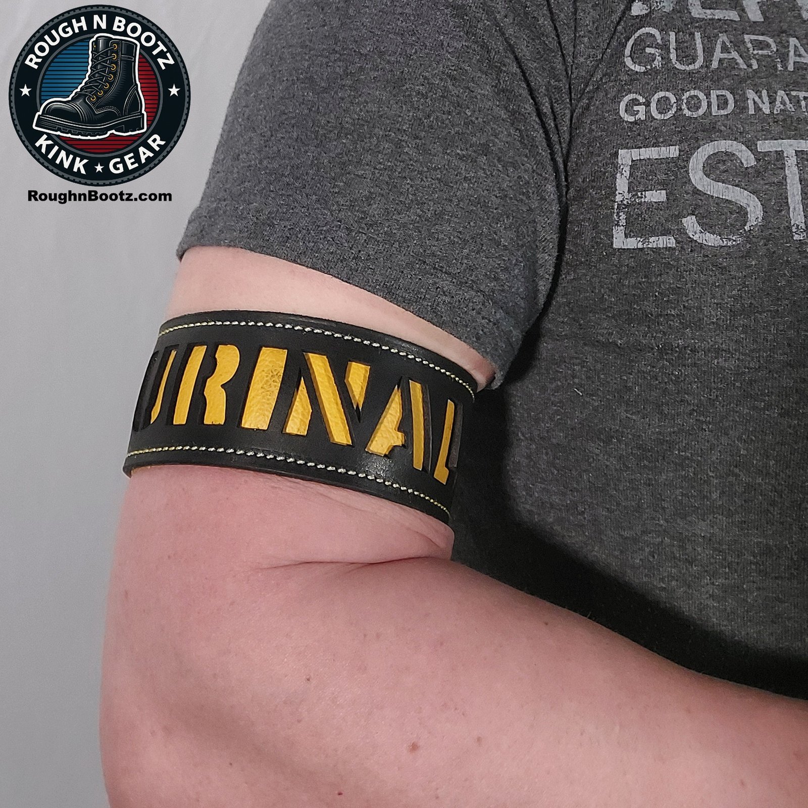 A suede-backed leather bicep strap designed for identity flagging, available in multiple sizes.